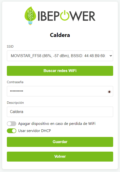 - En el menú de configuración, puede modificar la red WIFI a la que se conecta el enchufe IbePlug, cambiar la descripción del dispositivo conectado y el comportamiento si el enchufe pierde la red WIFI.